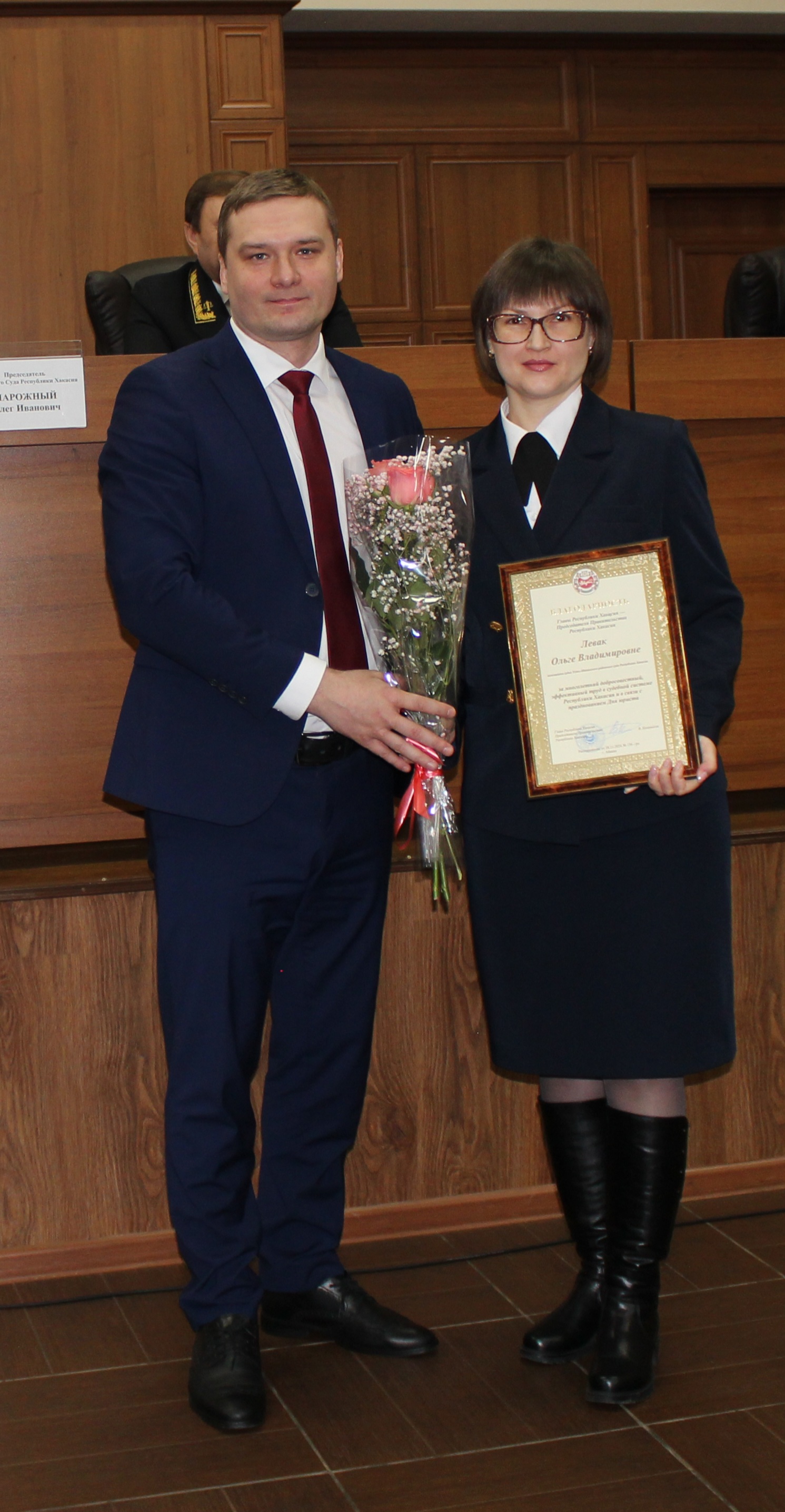 В преддверии Дня Конституции Российской Федерации 10 декабря в Верховном Суде Республики Хакасия прошло торжественное мероприятие, также посвященное Дню юриста. На нем были вручены государственные награды Республики Хакасия и ведомственные награды судебной системы Российской Федерации. Участниками данного торжественного собрания стали Глава Республики Хакасия – Председатель Правительства Республики Хакасия – Коновалов Валентин Олегович и Главный федеральный инспектор по Республике Хакасия Соковиков Андрей Эдуардович. В торжественной обстановке, в том числе, и сотрудникам нашего суда: начальнику отдела обеспечения судопроизводства - Вохминой Марине Ивановне, помощнику судьи Левак Ольге Владимировне за многолетний добросовестный, эффективный труд в судебной системе Республики Хакасия и связи с празднованием Дня юриста вручена Благодарность Главы Республики Хакасия – Председателя Правительства Республики Хакасия. Пожелания дальнейших успехов в служебной деятельности коллегам прозвучали от Председателя Верховного Суда Республики Хакасия Нарожного Олега Ивановича и почетных гостей. Коллектив Усть-Абаканского районного суда искренне поздравляет Марину Ивановну и Ольгу Владимировну с этим значительным событием в их профессиональной деятельности. Помощник председателя Оксана Лобанова |